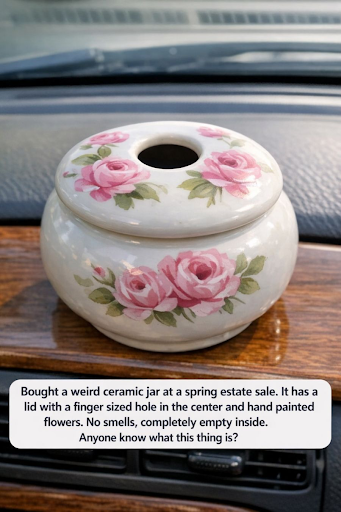 The ceramic jar stands approximately 5 inches tall and 4 inches in diameter. Its smooth, glossy surface is decorated with delicate hand-painted flowers that suggest it was crafted with care and skill. The flowers, painted in soft hues of pink and blue, add a touch of elegance and beauty to the jar’s overall appearance. The most perplexing feature, however, is the lid. It fits snugly on the top of the jar and has a perfectly round hole in its center, about the size of an average human finger.