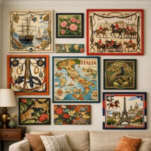 For a gallery display, arrange multiple scarves of different sizes and designs in a cohesive pattern on a wall. This creates a dynamic and personalized art installation that can easily be updated or rearranged. Scarves that are around 36 inches square fit well on standard canvas frames, making them versatile for various display options.