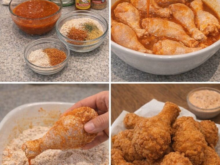 Dredge the chicken in the flour, back to the mixture it was marinating in and then back into the flour.