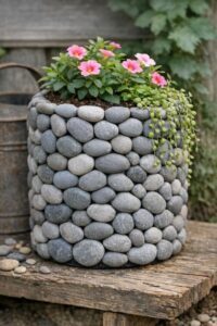This DIY planter can be styled beautifully in various settings. It complements a rustic or natural-themed interior, adding texture and a sense of the outdoors. Place it in a living room corner, on a patio, or as a centerpiece on a dining table. Pair it with greenery or succulents to enhance its natural appeal. Neutral tones in your decor will harmonize well with the grey stones, creating a cohesive look.