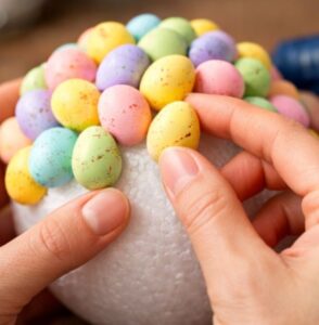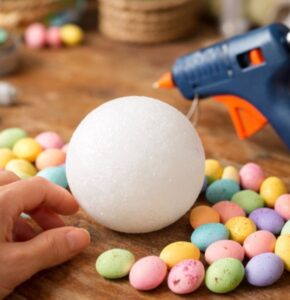 Begin by adhering the mini plastic eggs to the Styrofoam ball, starting from the top and working your way down. Apply a small amount of hot glue to each egg and press it firmly onto the ball.