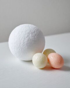 Once all 45 eggs are securely attached, insert the wooden dowel into the bottom of the Styrofoam ball to create a stem for your topiary.