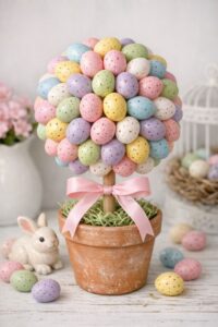 This DIY Easter egg topiary can be styled in various ways to complement your home decor. Place it as a centerpiece on your dining table for a festive touch, or use it to adorn a mantelpiece or entryway console. Pair it with other spring-themed decorations, such as fresh flowers or a pastel-colored table runner, to create a cohesive and inviting space. The soft pastel hues of the eggs will blend beautifully with neutral or bright color schemes, adding a pop of color without overwhelming the room.