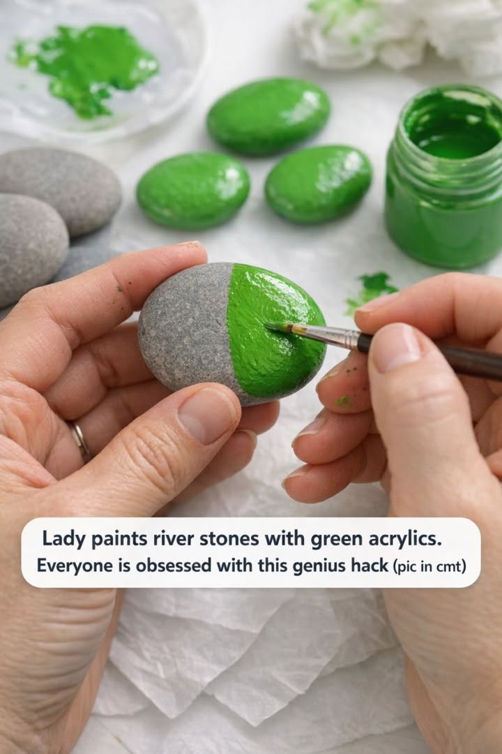 Use bright green acrylic paint to cover the surface of each stone. Apply multiple coats as needed for a rich, even color.