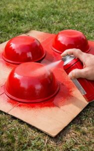 In a well-ventilated area, spray or paint the outside of each bowl with red paint. Apply multiple coats if necessary, allowing each coat to dry completely.
