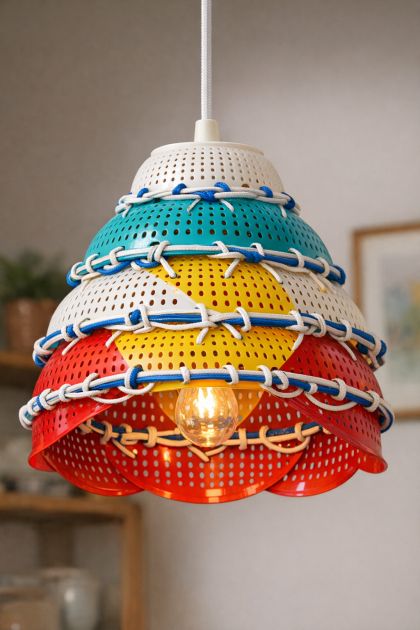 reating unique and stylish home decor doesn’t have to break the bank. This DIY project transforms ordinary plastic colanders from the Dollar Store into a stunning sculptural pendant light. By weaving these everyday items with colorful cords, you can craft a bespoke piece that adds a touch of artistic flair to any room. This project is perfect for those who love upcycling and want to add a personal touch to their living space while staying budget-friendly.