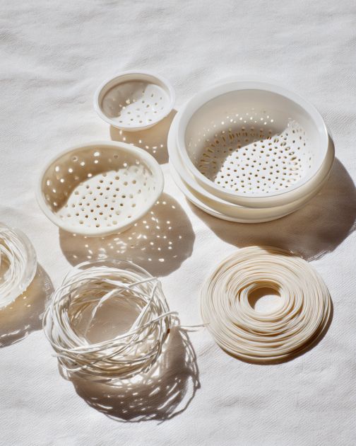 Take the nylon cord and begin weaving it through the holes of both colanders. Create a pattern by looping and crossing the cord, experimenting with different designs to find what you like best.