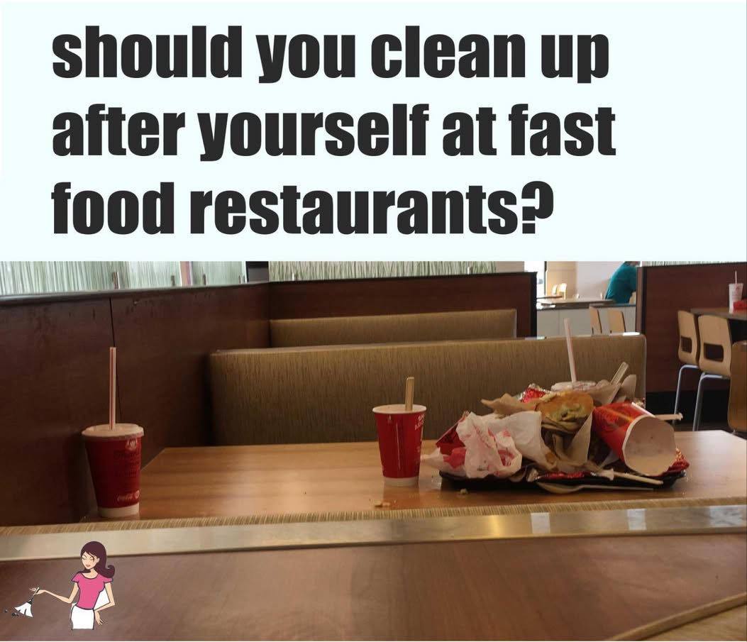 In fast-food environments, clearing your tray is part of the system. You’re not being asked to mop floors or sanitize tables—just to take responsibility for your own waste.