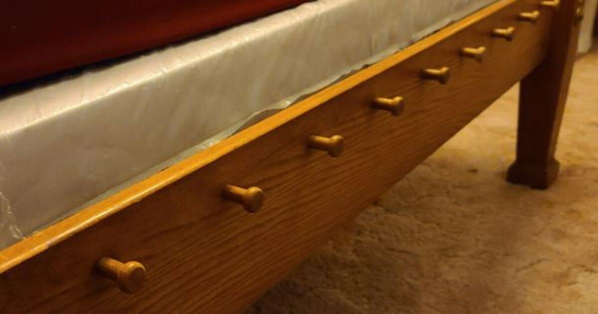 Ropes, however, do not continue to stay tight. In a few nights, or with a kid hopping on, you’d have a hammock situation. And so, people used these wooden pegs as part of like tightening the ropes. Pegs would slip into holes in the bed frame, and you’d crank things back into position, and everything was once again firm.